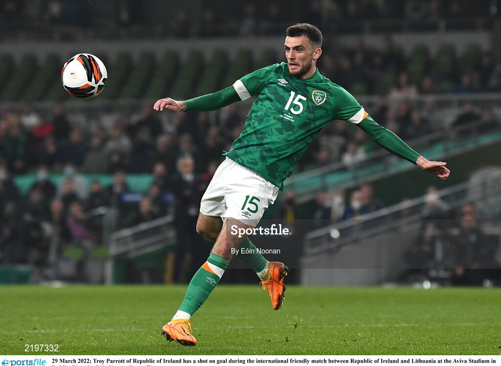 29 March 2022; Troy Parrott of Republic of Ireland has a shot on goal during the international friendly match between Republic of Ireland and Lithuania at the Aviva Stadium in Dublin. Photo by Eóin Noonan/Sportsfile