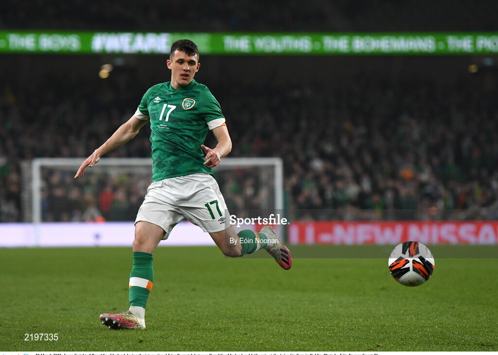 29 March 2022; Jason Knight of Republic of Ireland during the international friendly match between Republic of Ireland and Lithuania at the Aviva Stadium in Dublin. Photo by Eóin Noonan/Sportsfile