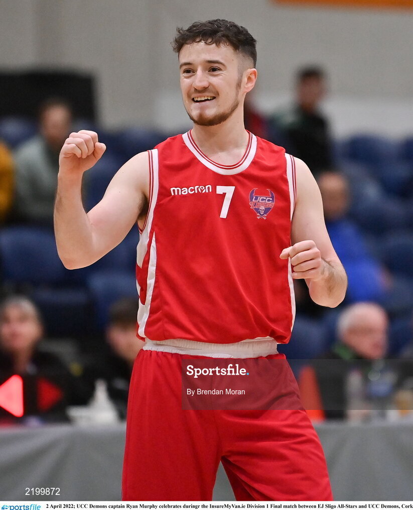 2 April 2022; UCC Demons captain Ryan Murphy celebrates duringr the InsureMyVan.ie Division 1 Final match between EJ Sligo All-Stars and UCC Demons, Cork at the National Basketball Arena in Dublin. Photo by Brendan Moran/Sportsfile