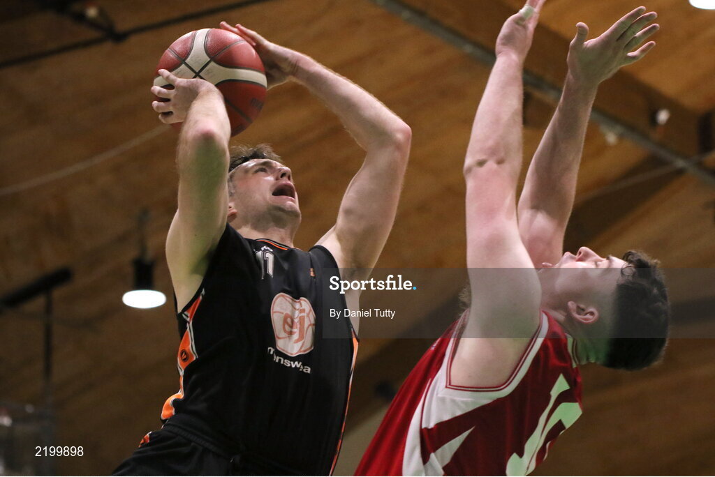2 April 2022; Cian Lally Jr of EJ Sligo All-Stars in action against David Lehane of UCC Demons during the InsureMyVan.ie Division 1 Final match between EJ Sligo All-Stars and UCC Demons, Cork at the National Basketball Arena in Dublin. Photo by Daniel Tutty/Sportsfile