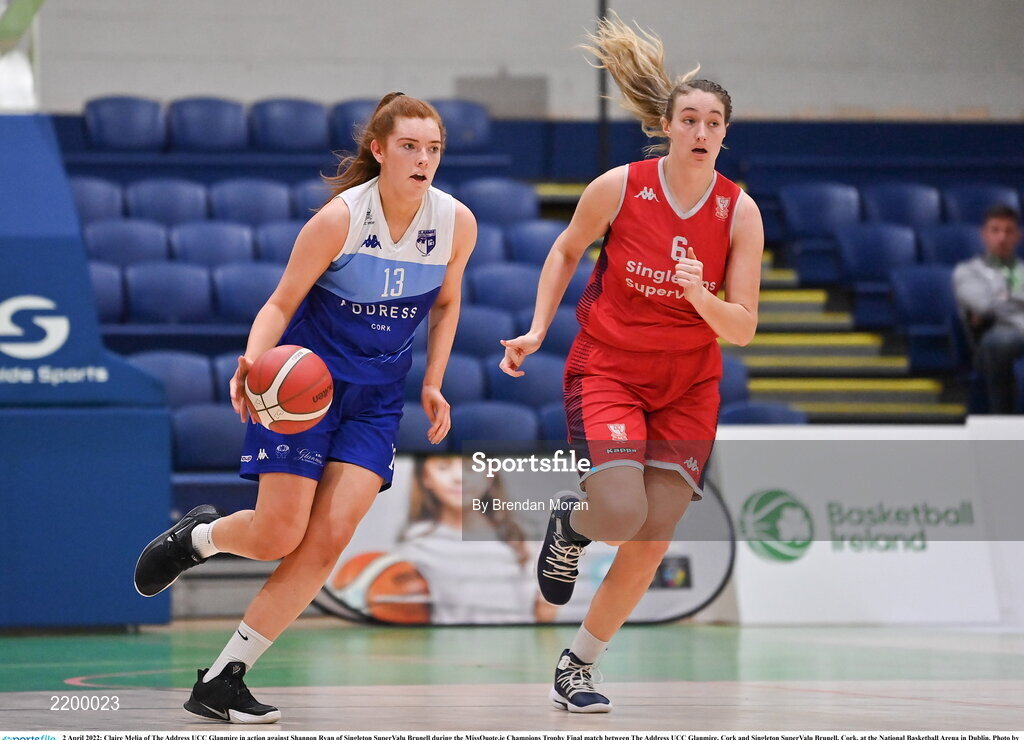 2 April 2022; Claire Melia of The Address UCC Glanmire in action against Shannon Ryan of Singleton SuperValu Brunell during the MissQuote.ie Champions Trophy Final match between The Address UCC Glanmire, Cork and Singleton SuperValu Brunell, Cork, at the National Basketball Arena in Dublin. Photo by Brendan Moran/Sportsfile