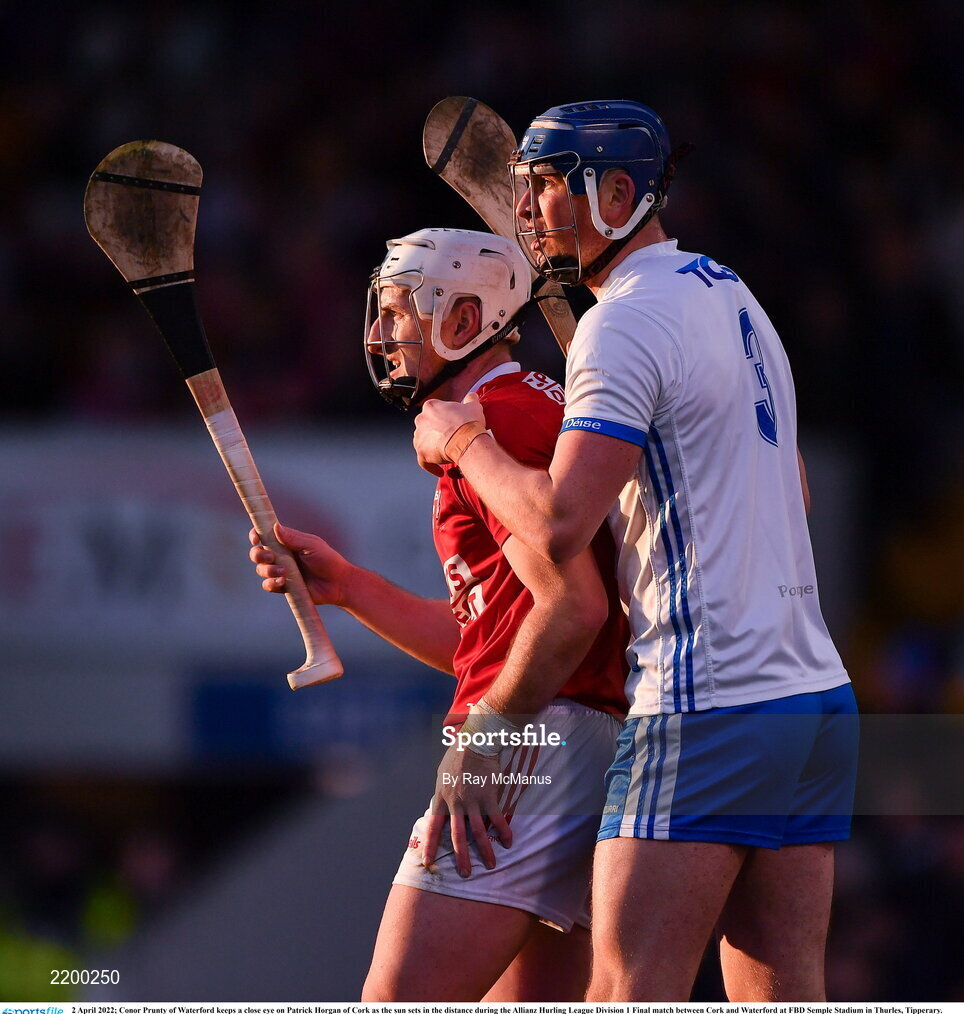 2 April 2022; Conor Prunty of Waterford keeps a close eye on Patrick Horgan of Cork as the sun sets in the distance during the Allianz Hurling League Division 1 Final match between Cork and Waterford at FBD Semple Stadium in Thurles, Tipperary. Photo by Ray McManus/Sportsfile