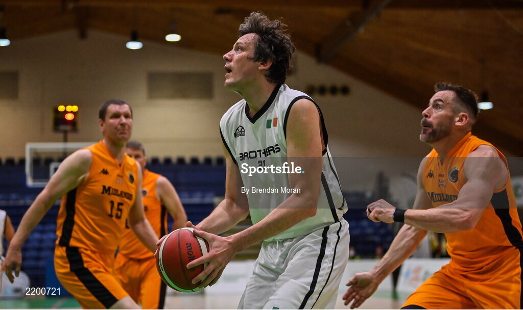 3 April 2022; Marius Kazlauskas of Dublin Vikings in action against Alan Burnell of Midland Masters during the InsureMyHouse.ie Masters Over 40’s Men National Cup Final match between Midlands Masters, Laois and Dublin Vikings at the National Basketball Arena in Dublin. Photo by Brendan Moran/Sportsfile