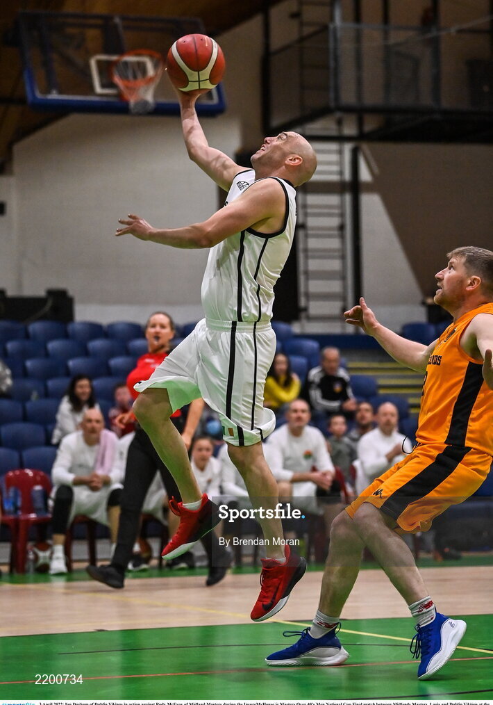 3 April 2022; Ian Durham of Dublin Vikings in action against Rody McEvoy of Midland Masters during the InsureMyHouse.ie Masters Over 40’s Men National Cup Final match between Midlands Masters, Laois and Dublin Vikings at the National Basketball Arena in Dublin. Photo by Brendan Moran/Sportsfile