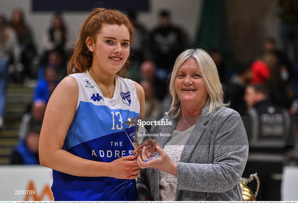 2 April 2022; Claire Melia of The Address UCC Glanmire is presented with her Women's Superleague Allstar award by Basketball Ireland WNLC chairperson Breda Dick after the MissQuote.ie Champions Trophy Final match between The Address UCC Glanmire, Cork and Singleton SuperValu Brunell, Cork, at the National Basketball Arena in Dublin. Photo by Brendan Moran/Sportsfile