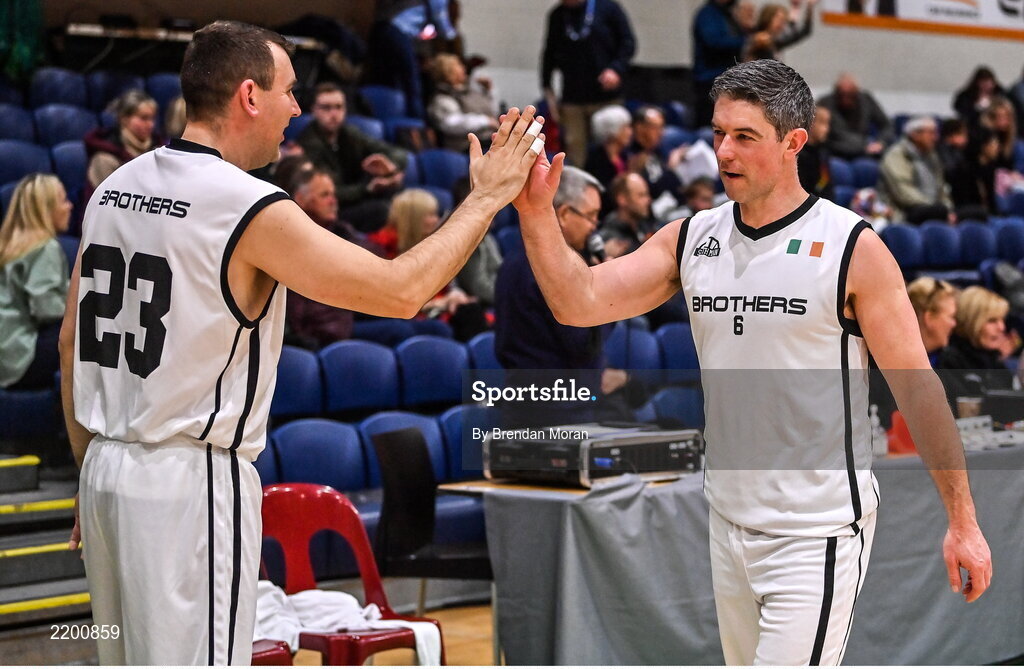 3 April 2022; Peder Madsen, right, and Solius Kulvelis of Dublin Vikings celebrate after the InsureMyHouse.ie Masters Over 40’s Men National Cup Final match between Midlands Masters, Laois and Dublin Vikings at the National Basketball Arena in Dublin. Photo by Brendan Moran/Sportsfile