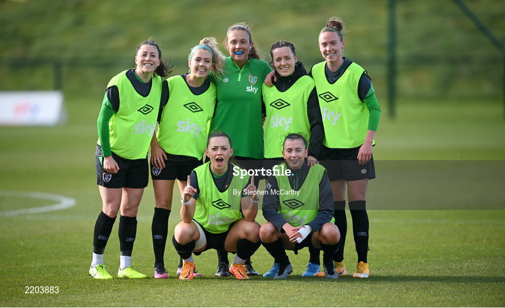 6 April 2022; Players, from left, Lucy Quinn, Denise O'Sullivan, Katie McCabe, front, goalkeeper Grace Moloney, Harriet Scott, Abbie Larkin, front, and Claire O'Riordan pose for a photograph after winning a game during a Republic of Ireland women training session at the FAI National Training Centre in Abbotstown, Dublin. Photo by Stephen McCarthy/Sportsfile