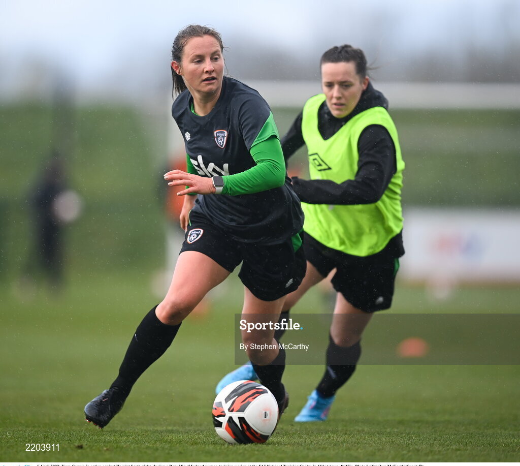 6 April 2022; Kyra Carusa in action against Harriet Scott, right, during a Republic of Ireland women training session at the FAI National Training Centre in Abbotstown, Dublin. Photo by Stephen McCarthy/Sportsfile