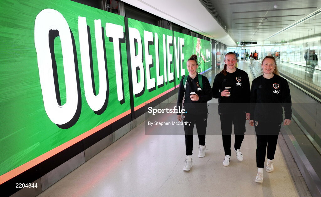 9 April 2022; Republic of Ireland players, from left, Claire O'Riordan, Courtney Brosnan and Amber Barrett at Dublin Airport before travelling to Sweden ahead of their FIFA Women's World Cup 2023 Qualifier match against Sweden on Tuesday. Photo by Stephen McCarthy/Sportsfile