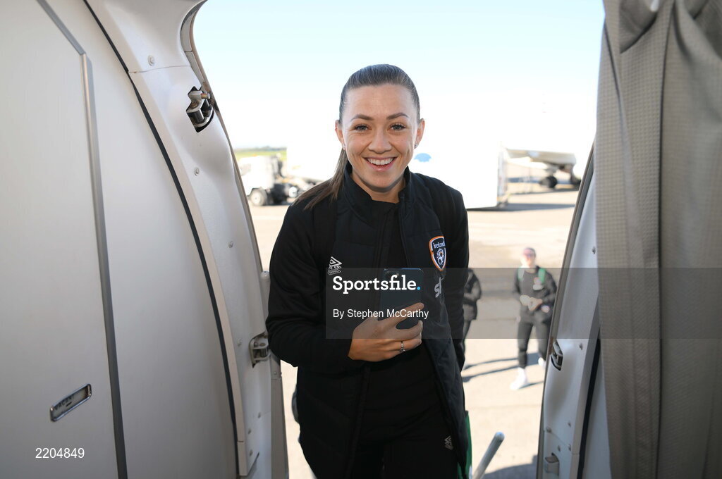 9 April 2022; Katie McCabe of Republic of Ireland boards the plane at Dublin Airport before travelling to Sweden ahead of their FIFA Women's World Cup 2023 Qualifier match against Sweden on Tuesday. Photo by Stephen McCarthy/Sportsfile