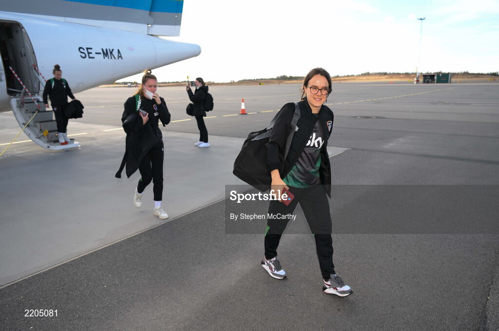 9 April 2022; Republic of Ireland's Ciara Grant arrives at Göteborg Landvetter Airport in Sweden ahead of their FIFA Women's World Cup 2023 Qualifier match against Sweden on Tuesday. Photo by Stephen McCarthy/Sportsfile
