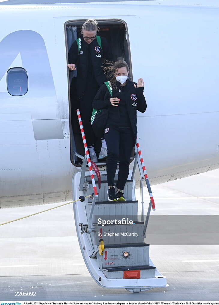 9 April 2022; Republic of Ireland's Harriet Scott arrives at Göteborg Landvetter Airport in Sweden ahead of their FIFA Women's World Cup 2023 Qualifier match against Sweden on Tuesday. Photo by Stephen McCarthy/Sportsfile