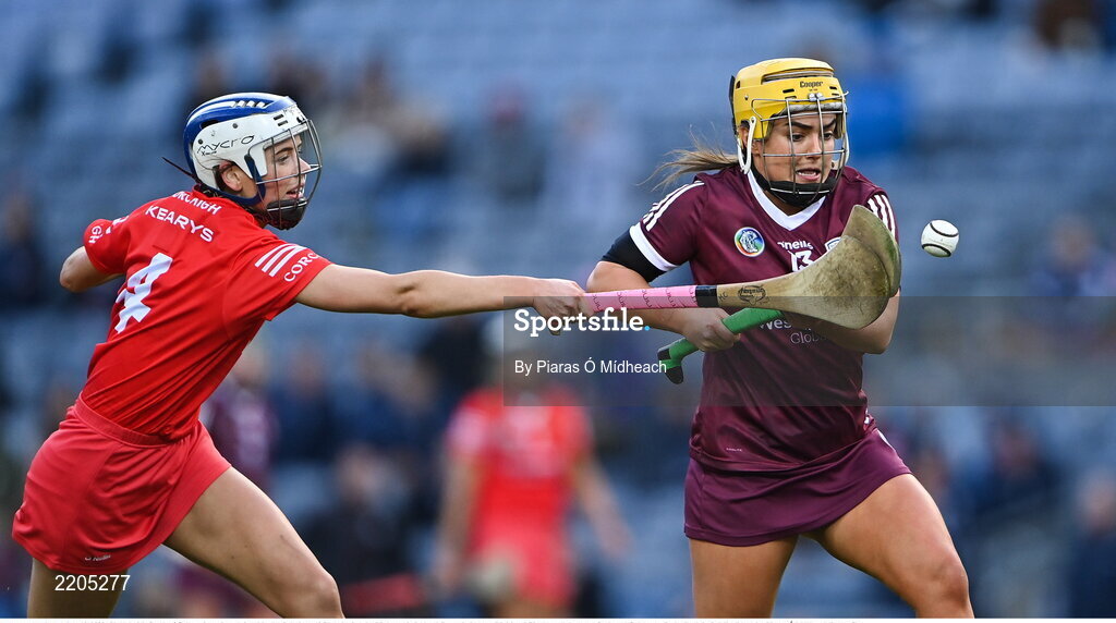 9 April 2022; Siobhán McGrath of Galway in action against Meabh Cahalane of Cork during the Littlewoods Ireland Camogie League Division 1 Final match between Cork and Galway at Croke Park in Dublin. Photo by Piaras Ó Mídheach/Sportsfile