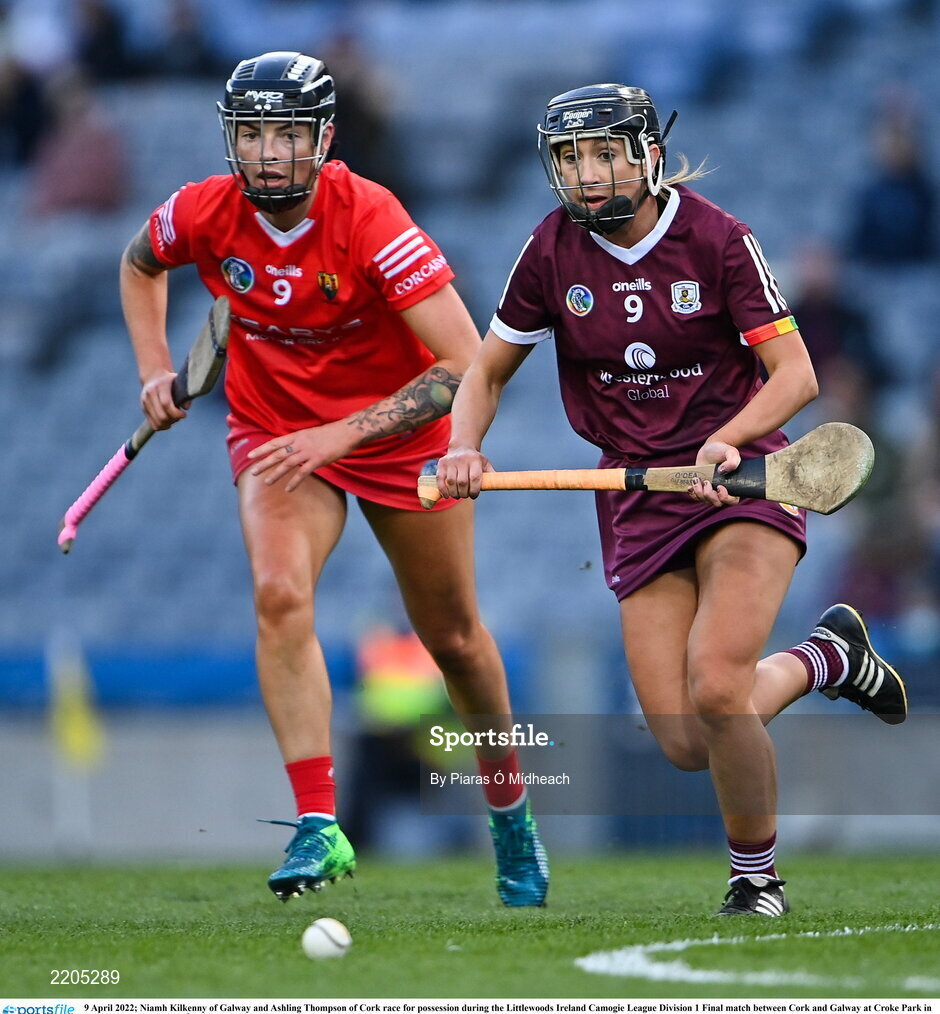 9 April 2022; Niamh Kilkenny of Galway and Ashling Thompson of Cork race for possession during the Littlewoods Ireland Camogie League Division 1 Final match between Cork and Galway at Croke Park in Dublin. Photo by Piaras Ó Mídheach/Sportsfile