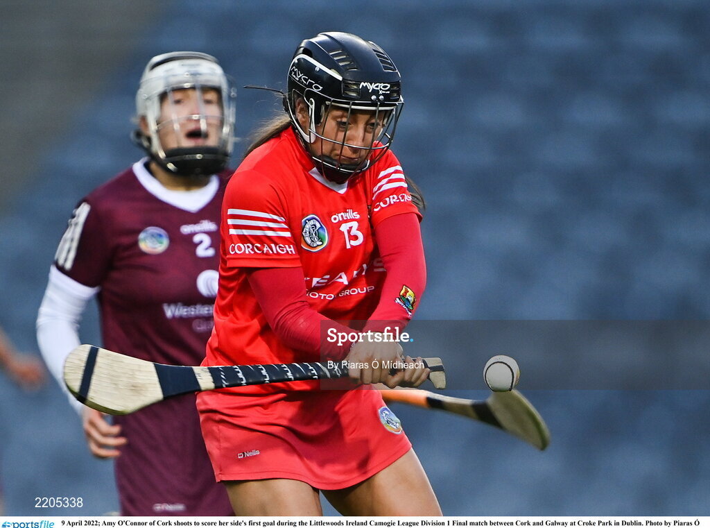 9 April 2022; Amy O'Connor of Cork shoots to score her side's first goal during the Littlewoods Ireland Camogie League Division 1 Final match between Cork and Galway at Croke Park in Dublin. Photo by Piaras Ó Mídheach/Sportsfile