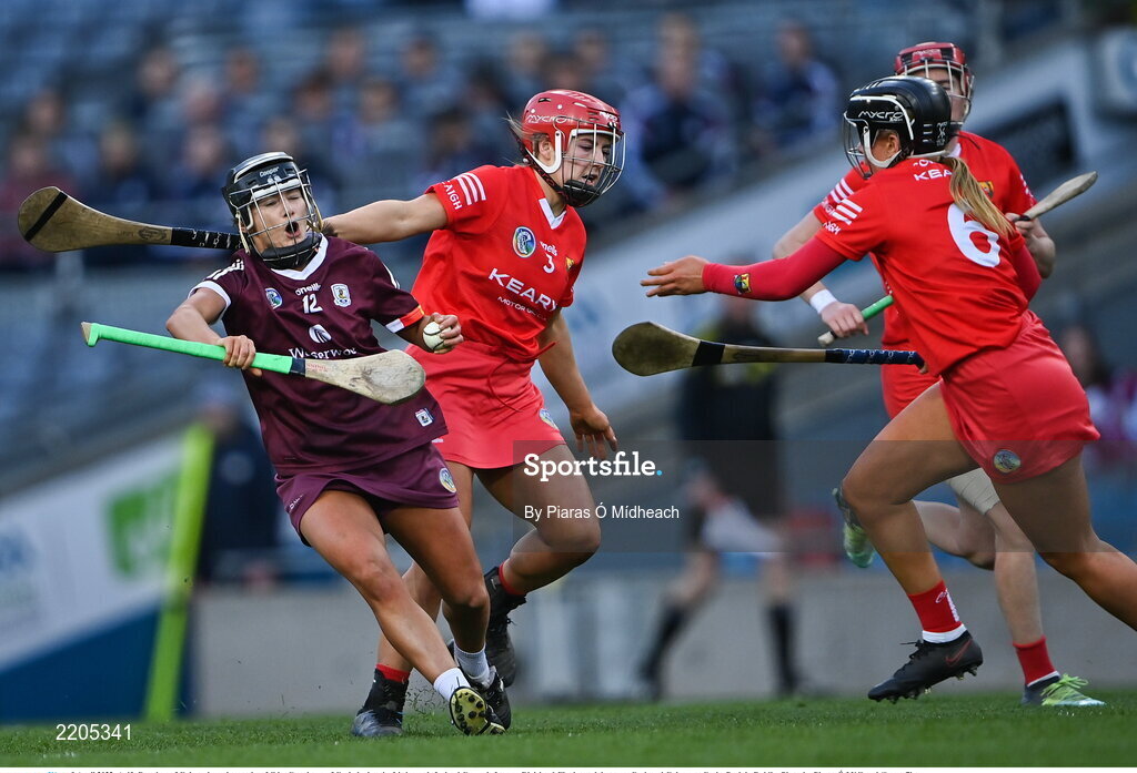 9 April 2022; Aoife Donohue of Galway in action against Libby Coppinger of Cork during the Littlewoods Ireland Camogie League Division 1 Final match between Cork and Galway at Croke Park in Dublin. Photo by Piaras Ó Mídheach/Sportsfile