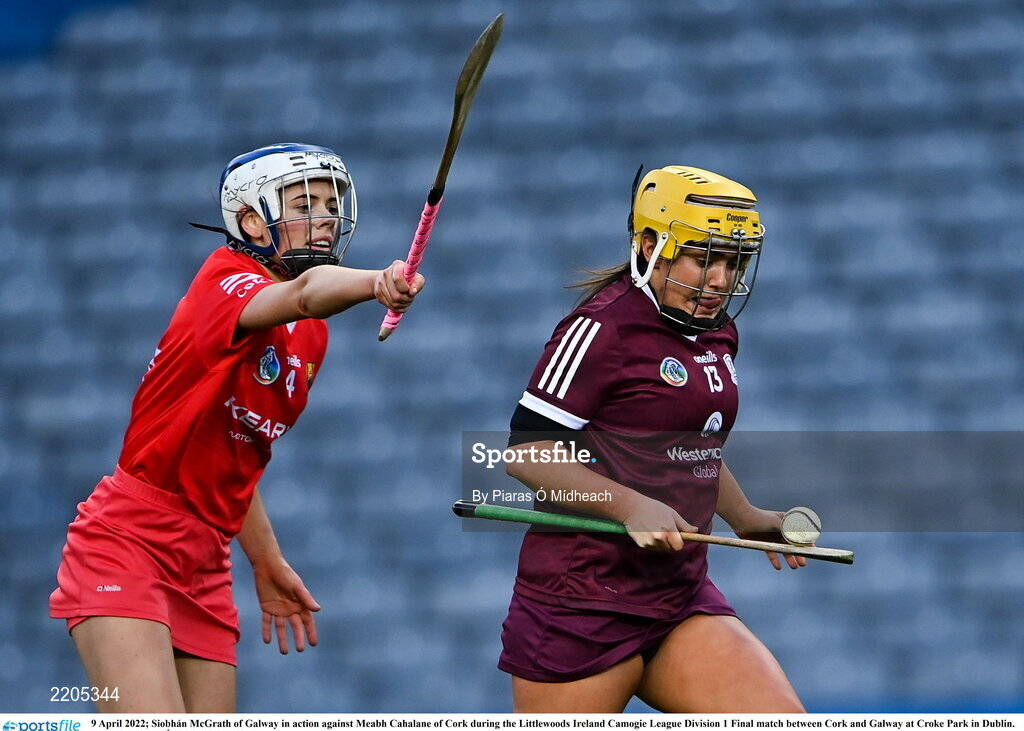 9 April 2022; Siobhán McGrath of Galway in action against Meabh Cahalane of Cork during the Littlewoods Ireland Camogie League Division 1 Final match between Cork and Galway at Croke Park in Dublin. Photo by Piaras Ó Mídheach/Sportsfile