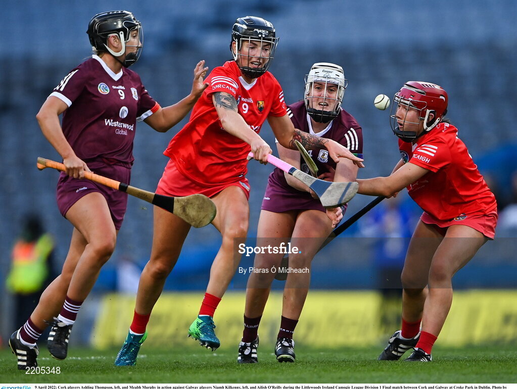 9 April 2022; Cork players Ashling Thompson, left, and Meabh Murphy in action against Galway players Niamh Kilkenny, left, and Ailish O'Reilly during the Littlewoods Ireland Camogie League Division 1 Final match between Cork and Galway at Croke Park in Dublin. Photo by Piaras Ó Mídheach/Sportsfile