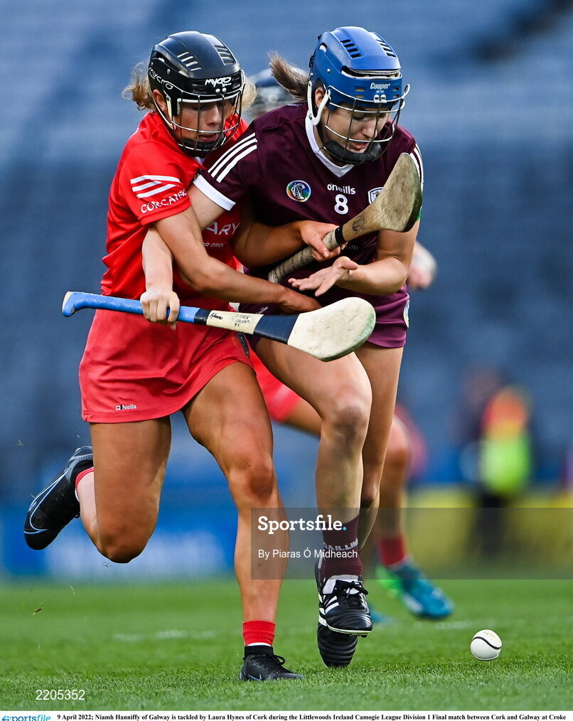 9 April 2022; Niamh Hanniffy of Galway is tackled by Laura Hynes of Cork during the Littlewoods Ireland Camogie League Division 1 Final match between Cork and Galway at Croke Park in Dublin. Photo by Piaras Ó Mídheach/Sportsfile
