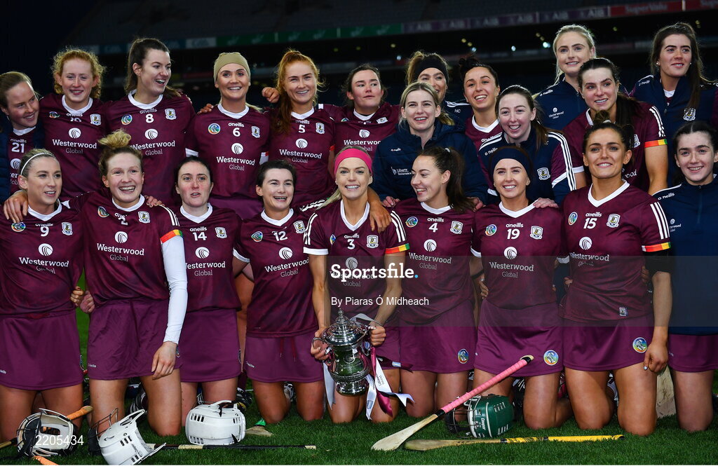 9 April 2022; Galway captain Sarah Dervan and her teammates celebrate with the cup after victory in the Littlewoods Ireland Camogie League Division 1 Final match between Cork and Galway at Croke Park in Dublin. Photo by Piaras Ó Mídheach/Sportsfile