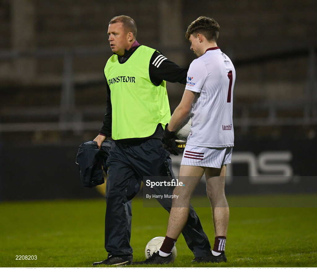 14 April 2022; Westmeath manager Damien Gavin consoles Westmeath goalkeeper Michael Lynam after their side's defeat in the EirGrid Leinster GAA Under 20 Football Championship Quarter-Final match between Dublin and Westmeath at Parnell Park in Dublin. Photo by Harry Murphy/Sportsfile