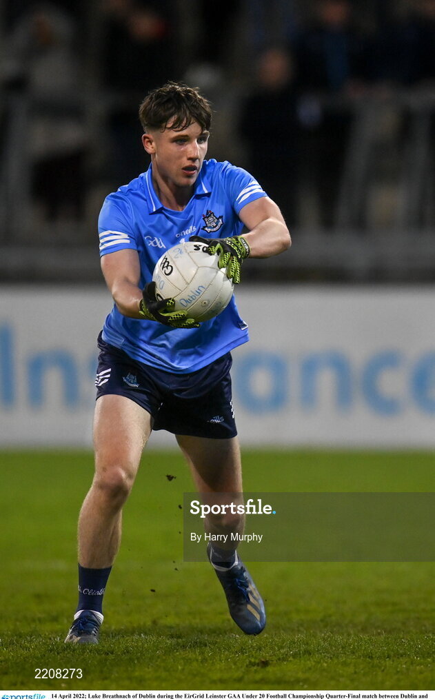 14 April 2022; Luke Breathnach of Dublin during the EirGrid Leinster GAA Under 20 Football Championship Quarter-Final match between Dublin and Westmeath at Parnell Park in Dublin. Photo by Harry Murphy/Sportsfile