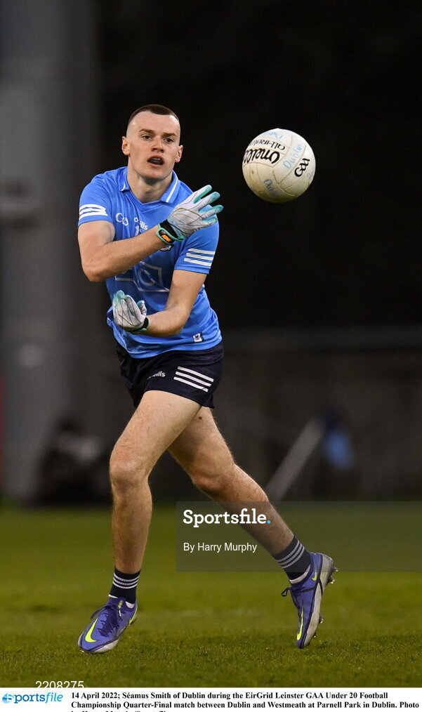 14 April 2022; Séamus Smith of Dublin during the EirGrid Leinster GAA Under 20 Football Championship Quarter-Final match between Dublin and Westmeath at Parnell Park in Dublin. Photo by Harry Murphy/Sportsfile