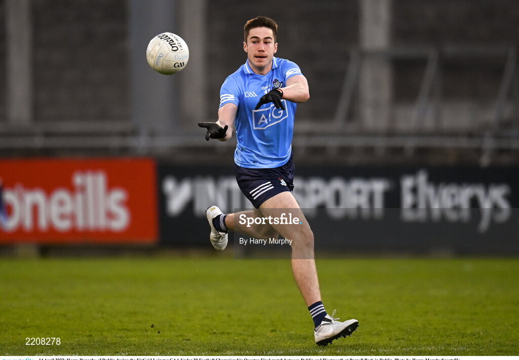 14 April 2022; Harry Donaghy of Dublin during the EirGrid Leinster GAA Under 20 Football Championship Quarter-Final match between Dublin and Westmeath at Parnell Park in Dublin. Photo by Harry Murphy/Sportsfile