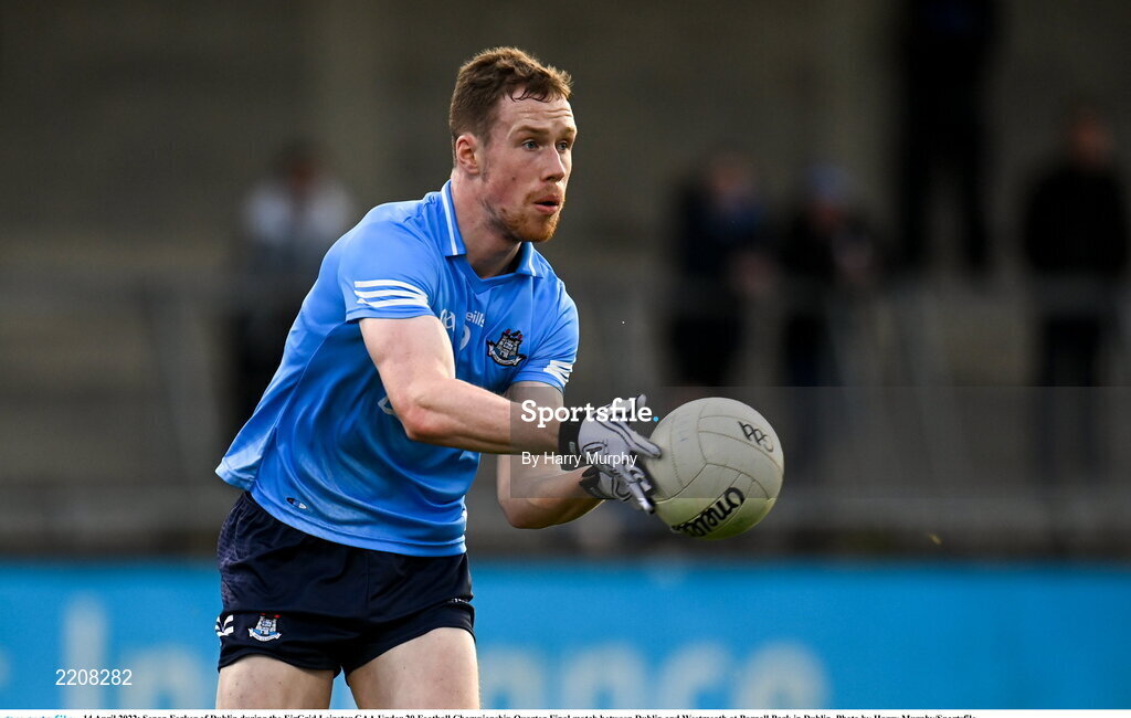 14 April 2022; Senan Forker of Dublin during the EirGrid Leinster GAA Under 20 Football Championship Quarter-Final match between Dublin and Westmeath at Parnell Park in Dublin. Photo by Harry Murphy/Sportsfile