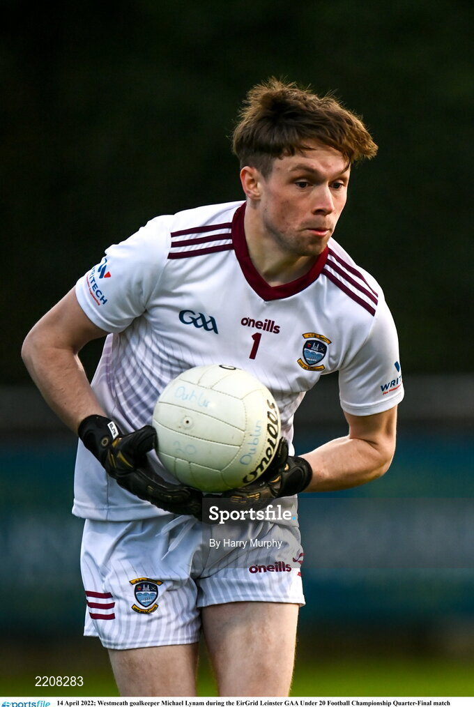 14 April 2022; Westmeath goalkeeper Michael Lynam during the EirGrid Leinster GAA Under 20 Football Championship Quarter-Final match between Dublin and Westmeath at Parnell Park in Dublin. Photo by Harry Murphy/Sportsfile