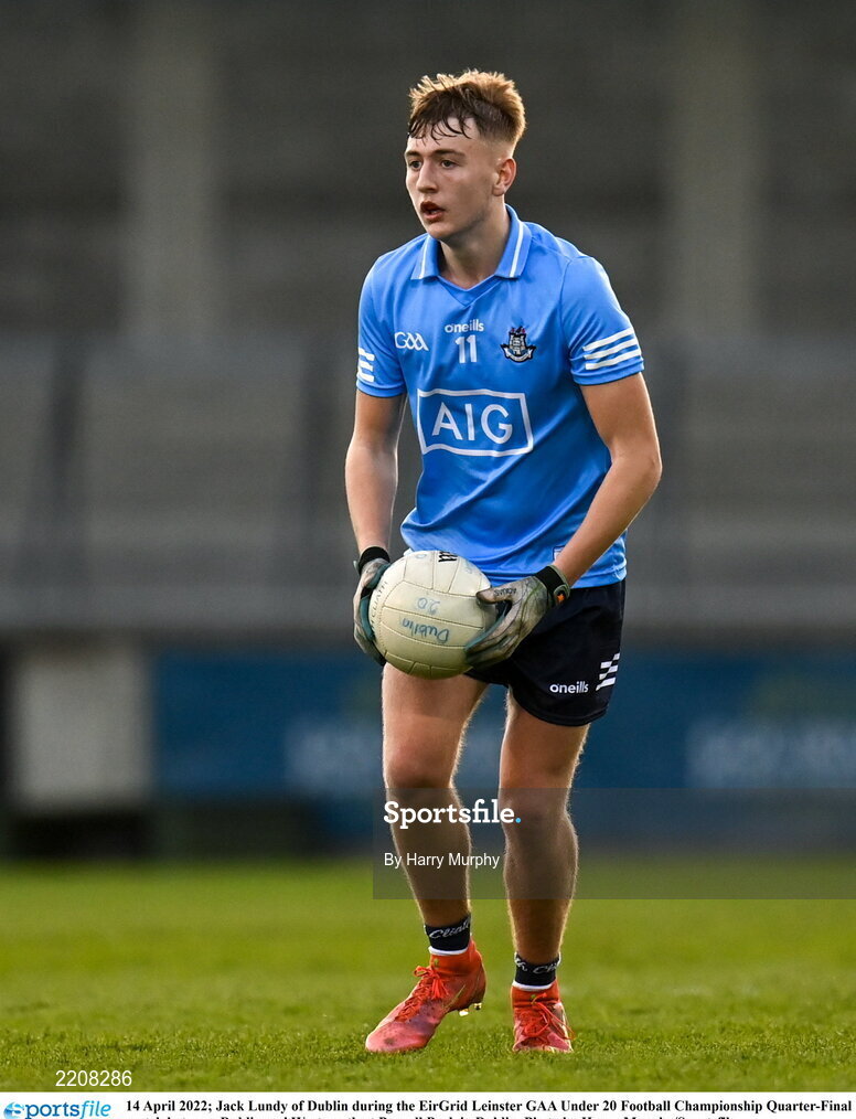 14 April 2022; Jack Lundy of Dublin during the EirGrid Leinster GAA Under 20 Football Championship Quarter-Final match between Dublin and Westmeath at Parnell Park in Dublin. Photo by Harry Murphy/Sportsfile