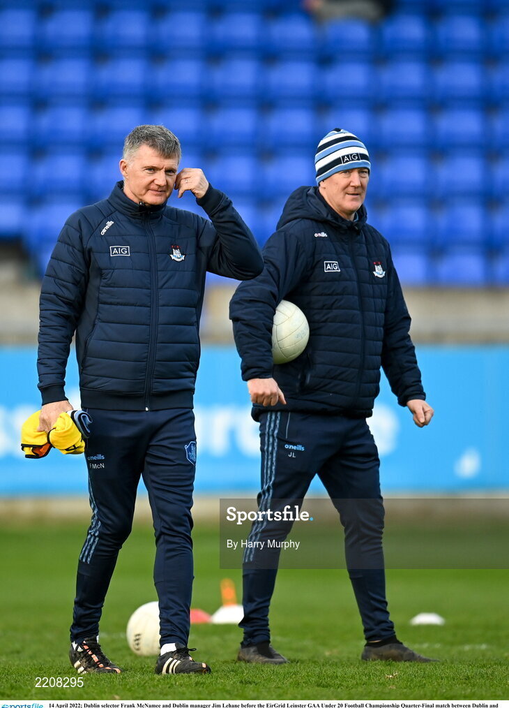 14 April 2022; Dublin selector Frank McNamee and Dublin manager Jim Lehane before the EirGrid Leinster GAA Under 20 Football Championship Quarter-Final match between Dublin and Westmeath at Parnell Park in Dublin. Photo by Harry Murphy/Sportsfile