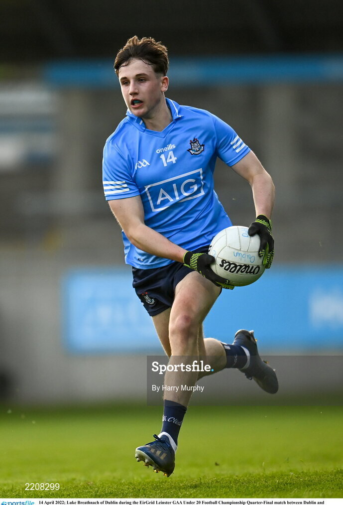 14 April 2022; Luke Breathnach of Dublin during the EirGrid Leinster GAA Under 20 Football Championship Quarter-Final match between Dublin and Westmeath at Parnell Park in Dublin. Photo by Harry Murphy/Sportsfile