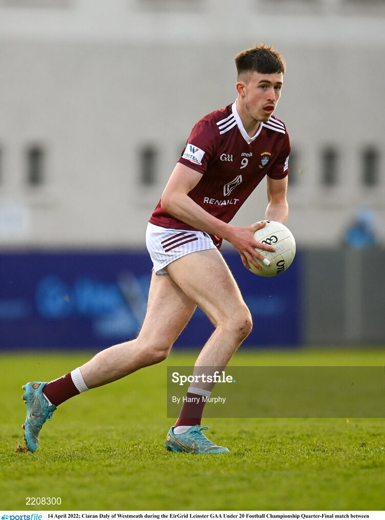 14 April 2022; Ciaran Daly of Westmeath during the EirGrid Leinster GAA Under 20 Football Championship Quarter-Final match between Dublin and Westmeath at Parnell Park in Dublin. Photo by Harry Murphy/Sportsfile
