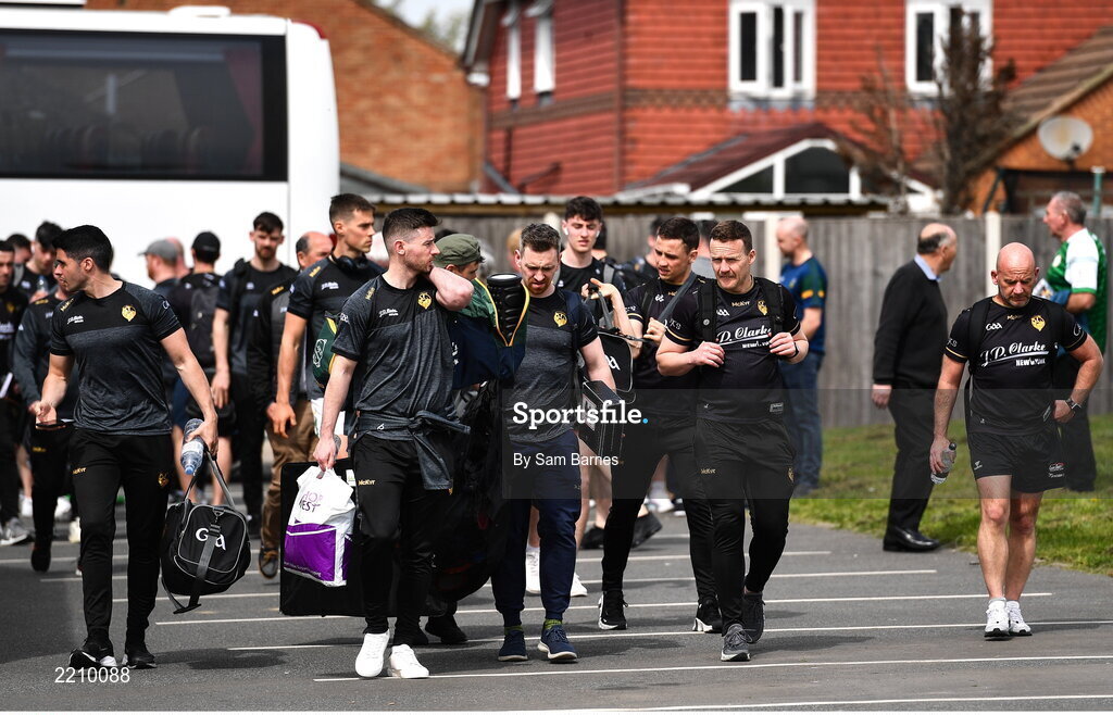 17 April 2022; Leitrim players and coaching staff, including Leitrim manager Andy Moran, second from right, arrive before the Connacht GAA Football Senior Championship Quarter-Final match between London and Leitrim at McGovern Park in Ruislip, London, England. Photo by Sam Barnes/Sportsfile