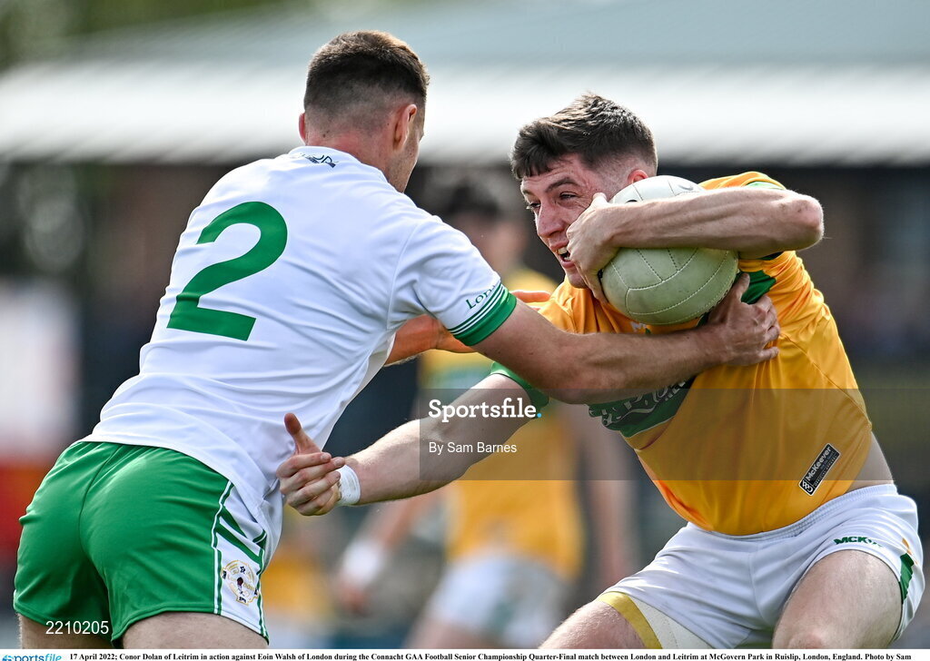 17 April 2022; Conor Dolan of Leitrim in action against Eoin Walsh of London during the Connacht GAA Football Senior Championship Quarter-Final match between London and Leitrim at McGovern Park in Ruislip, London, England. Photo by Sam Barnes/Sportsfile