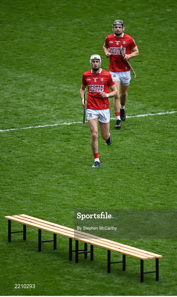 17 April 2022; Cork players Tim O'Mahony, left, and Mark Coleman make their way to the bench for the team photograph before the Munster GAA Hurling Senior Championship Round 1 match between Cork and Limerick at Páirc Uí Chaoimh in Cork. Photo by Stephen McCarthy/Sportsfile
