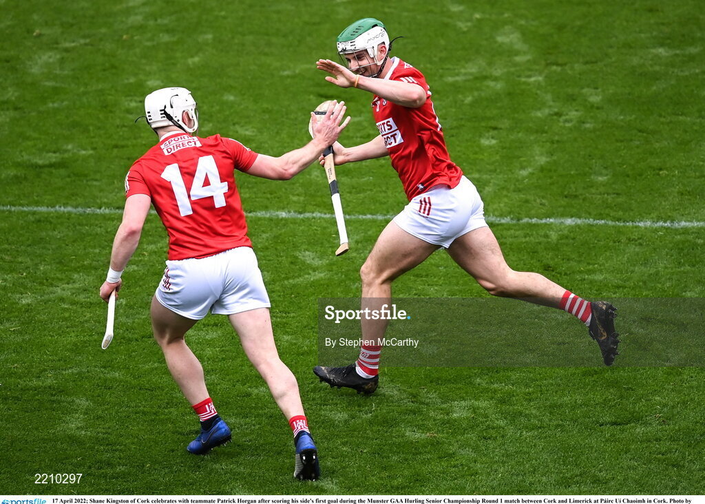 17 April 2022; Shane Kingston of Cork celebrates with teammate Patrick Horgan after scoring his side's first goal during the Munster GAA Hurling Senior Championship Round 1 match between Cork and Limerick at Páirc Uí Chaoimh in Cork. Photo by Stephen McCarthy/Sportsfile