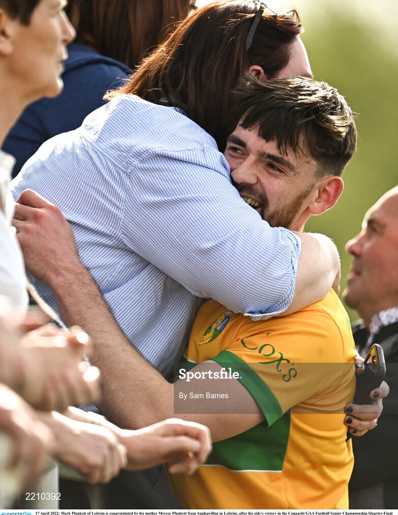 17 April 2022; Mark Plunkett of Leitrim is congratulated by his mother Merese Plunkett from Aughawillan in Leitrim, after his side's victory in the Connacht GAA Football Senior Championship Quarter-Final match between London and Leitrim at McGovern Park in Ruislip, London, England. Photo by Sam Barnes/Sportsfile