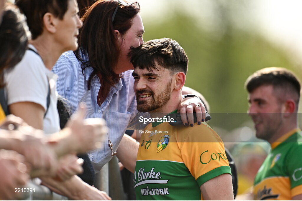 17 April 2022; Mark Plunkett of Leitrim is congratulated by his mother Merese Plunkett from Aughawillan in Leitrim, after his side's victory in the Connacht GAA Football Senior Championship Quarter-Final match between London and Leitrim at McGovern Park in Ruislip, London, England. Photo by Sam Barnes/Sportsfile