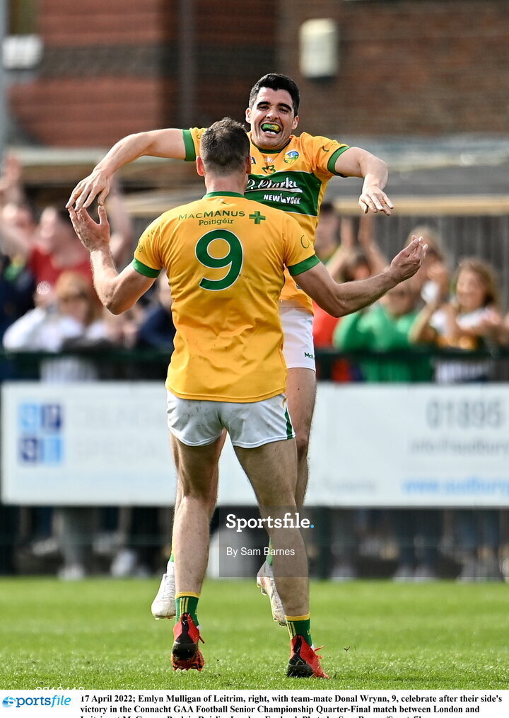 17 April 2022; Emlyn Mulligan of Leitrim, right, with team-mate Donal Wrynn, 9, celebrate after their side's victory in the Connacht GAA Football Senior Championship Quarter-Final match between London and Leitrim at McGovern Park in Ruislip, London, England. Photo by Sam Barnes/Sportsfile