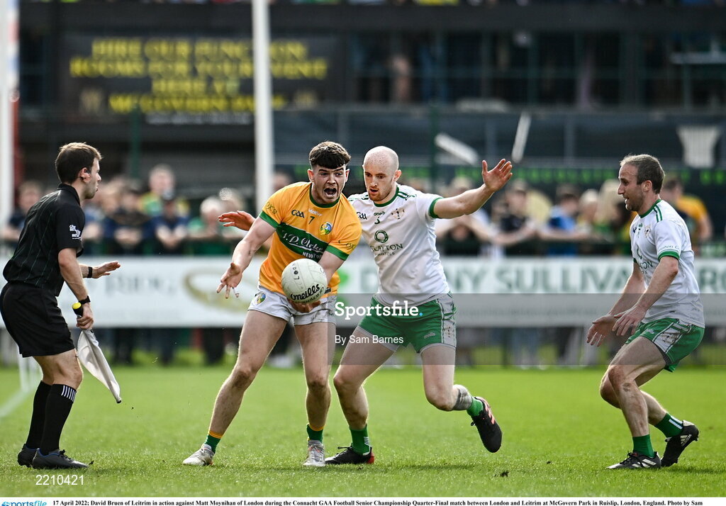 17 April 2022; David Bruen of Leitrim in action against Matt Moynihan of London during the Connacht GAA Football Senior Championship Quarter-Final match between London and Leitrim at McGovern Park in Ruislip, London, England. Photo by Sam Barnes/Sportsfile