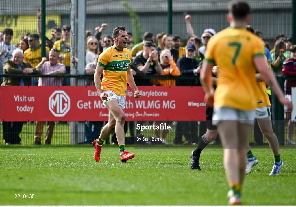 17 April 2022; Donal Wrynn of Leitrim celebrates after scoring his side's second goal during the Connacht GAA Football Senior Championship Quarter-Final match between London and Leitrim at McGovern Park in Ruislip, London, England. Photo by Sam Barnes/Sportsfile