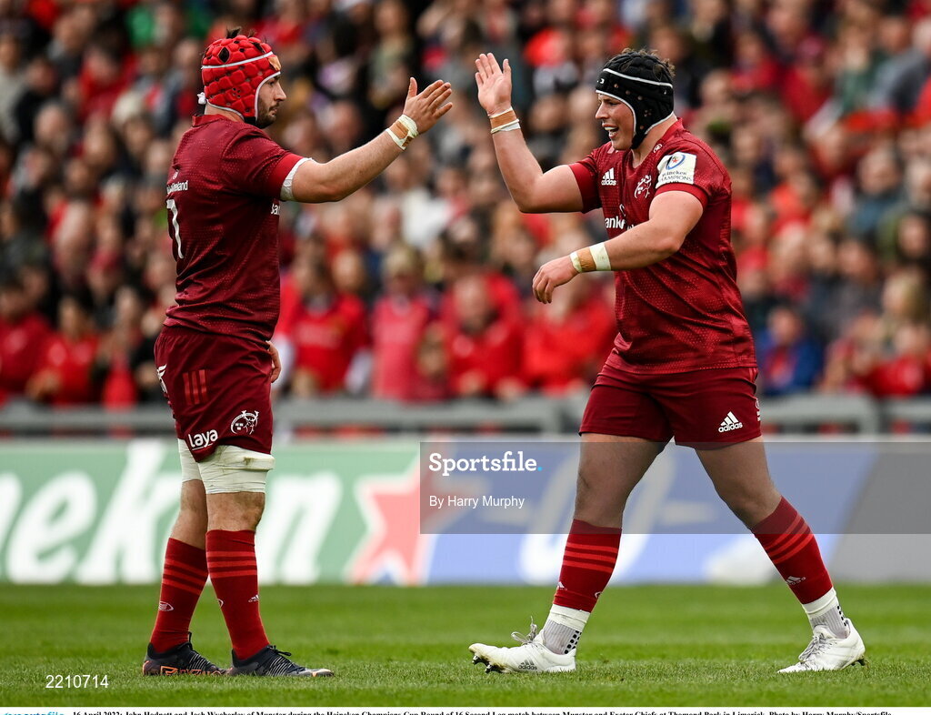 16 April 2022; John Hodnett and Josh Wycherley of Munster during the Heineken Champions Cup Round of 16 Second Leg match between Munster and Exeter Chiefs at Thomond Park in Limerick. Photo by Harry Murphy/Sportsfile