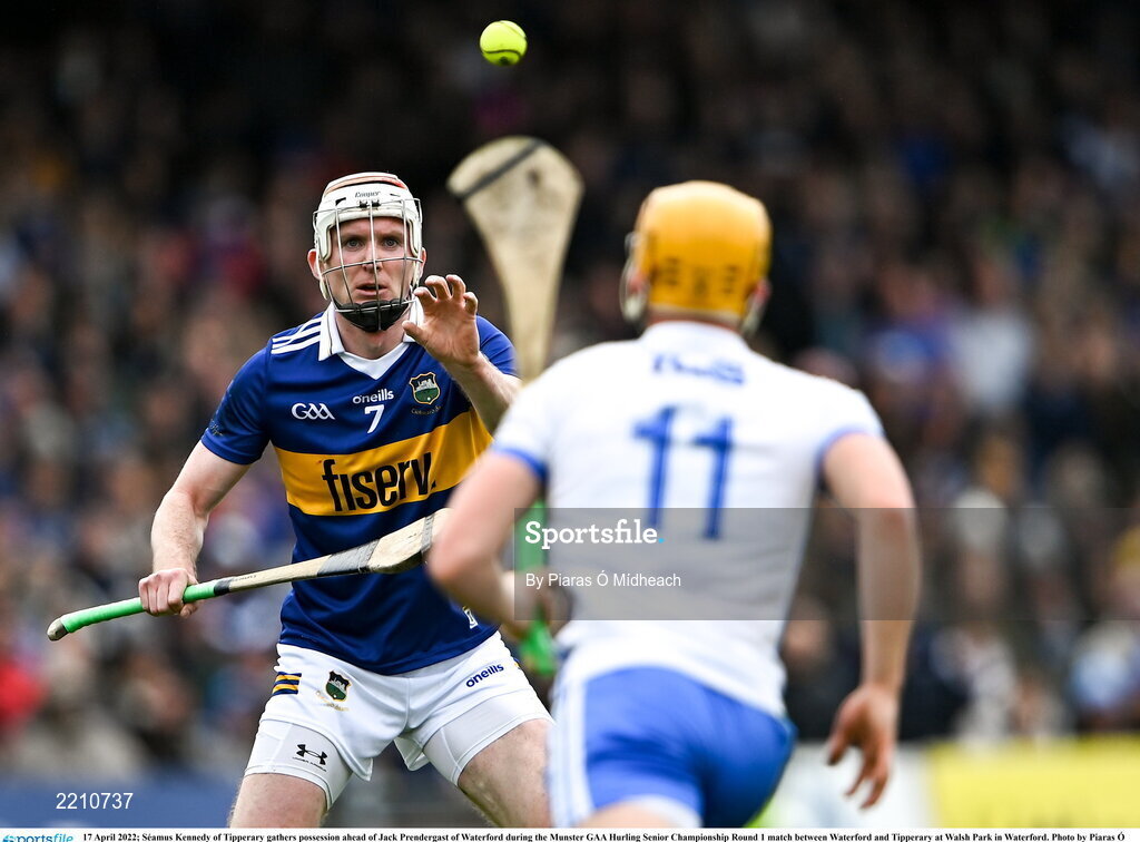 17 April 2022; Séamus Kennedy of Tipperary gathers possession ahead of Jack Prendergast of Waterford during the Munster GAA Hurling Senior Championship Round 1 match between Waterford and Tipperary at Walsh Park in Waterford. Photo by Piaras Ó Mídheach/Sportsfile