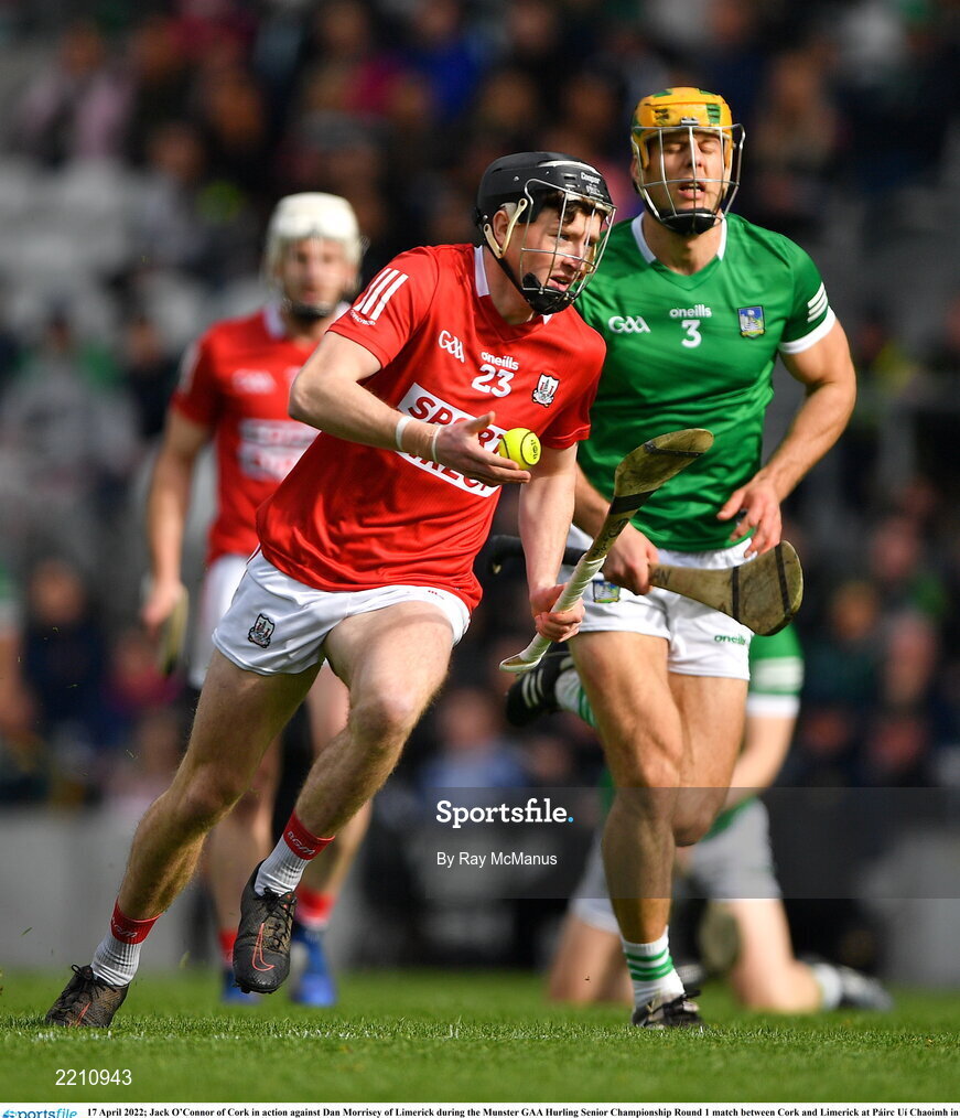 17 April 2022; Jack O’Connor of Cork in action against Dan Morrisey of Limerick during the Munster GAA Hurling Senior Championship Round 1 match between Cork and Limerick at Páirc Uí Chaoimh in Cork. Photo by Ray McManus/Sportsfile