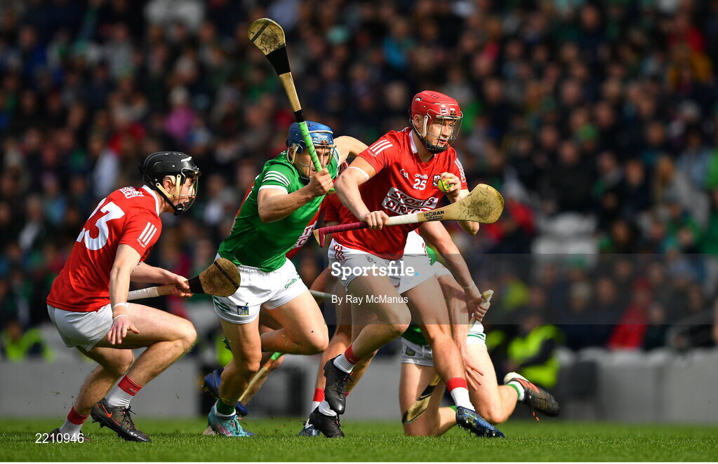 17 April 2022; Alan Connolly of Cork, supported by Jack O’Connor, left, breaks clear of Mike Casey of Limerick during the Munster GAA Hurling Senior Championship Round 1 match between Cork and Limerick at Páirc Uí Chaoimh in Cork. Photo by Ray McManus/Sportsfile