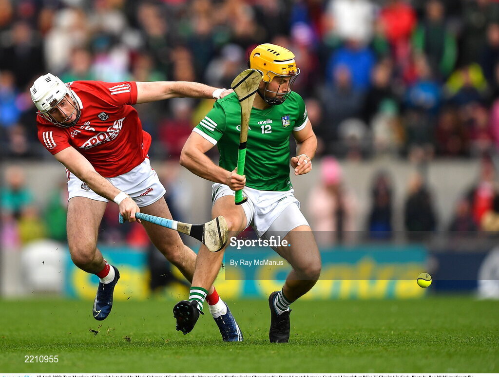 17 April 2022; Tom Morrisey of Limerick is tackled by Mark Coleman of Cork during the Munster GAA Hurling Senior Championship Round 1 match between Cork and Limerick at Páirc Uí Chaoimh in Cork. Photo by Ray McManus/Sportsfile