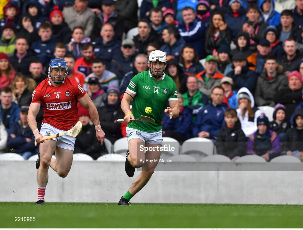 17 April 2022; Aaron Gillane of Limerick races clear of Sean O’Donoghue of Cork during the Munster GAA Hurling Senior Championship Round 1 match between Cork and Limerick at Páirc Uí Chaoimh in Cork. Photo by Ray McManus/Sportsfile