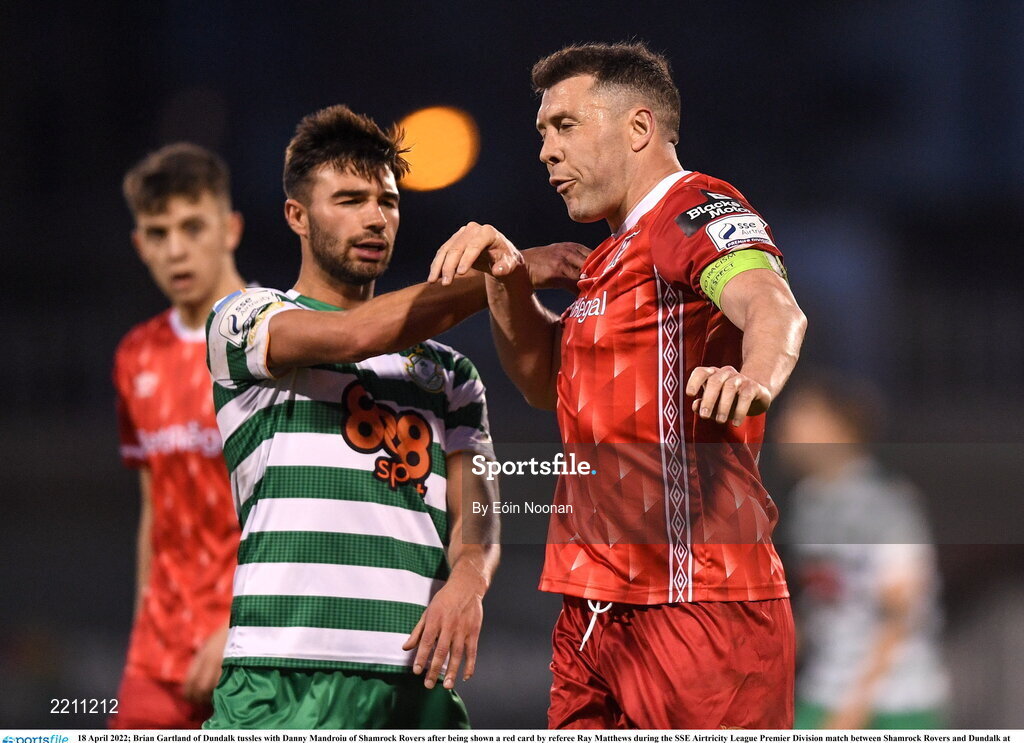 18 April 2022; Brian Gartland of Dundalk tussles with Danny Mandroiu of Shamrock Rovers after being shown a red card by referee Ray Matthews during the SSE Airtricity League Premier Division match between Shamrock Rovers and Dundalk at Tallaght Stadium in Dublin. Photo by Eóin Noonan/Sportsfile